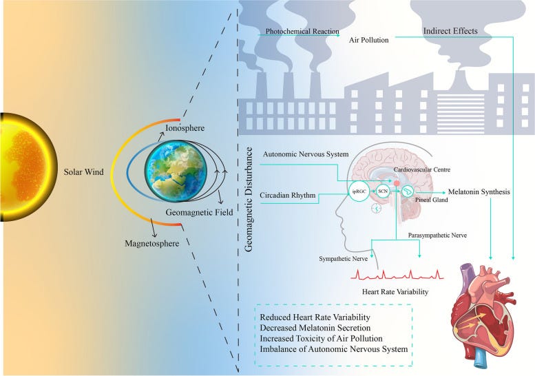 Research has also indicated that geomagnetic activity may amplify the harmful effects of air pollution on cardiovascular health. In particular, strong geomagnetic disturbances have been shown to enhance the cardiovascular impact of common air pollutants such as PM2.5, nitrogen dioxide (NO₂), black carbon (BC), and ultrafine particles. This suggests that environmental stressors can interact in complex ways to increase cardiovascular risk.
